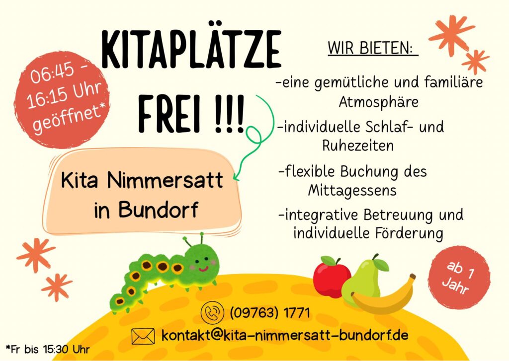 wir begrüßen Sie ganz herzlich in der Kindertagesstätte „Nimmersatt“ Bundorf. In unserer KITA findet Ihr Kind vielfältige Möglichkeiten seinen Interessen nachzugehen. Wir geben Ihrem Kind Zeit seine Stärken zu entdecken und sich in seinem eigenen Tempo weiterzuentwickeln. Gemeinsam mit Ihnen wollen wir für Ihr Kind eine Umgebung schaffen, in der es sich mit seinen Bedürfnissen wahrgenommen und akzeptiert fühlt. Wir freuen uns, Sie ein Stück des Weges begleiten zu dürfen, in dessen Mittelpunkt das Wohlbefinden Ihres Kindes steht. Falls wir Ihr Interesse geweckt haben, kommen Sie gerne vorbei, um unser Kindergarten-Team kennenzulernen.